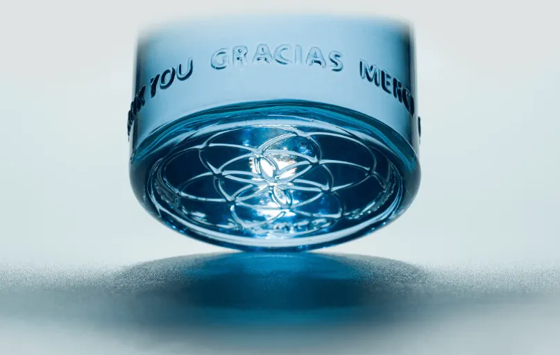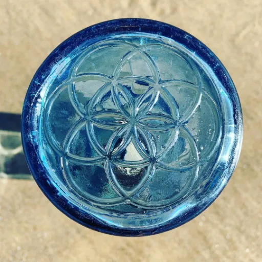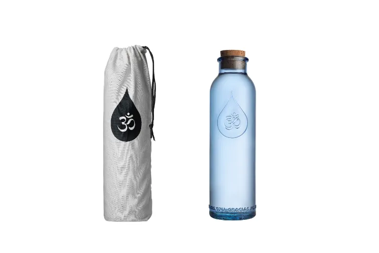 Le Ratio d’Or (la structure que nous trouvons dans la Nature), le symbole OM (le son de la Création), la couleur Bleue pour solariser l’eau, la Graine de Vie pulsant du fond et la Gratitude, sont unis dans cette bouteille pour augmenter positivement la vibration de l’eau et donc, aussi de ceux qui boivent l’eau de cette bouteille!