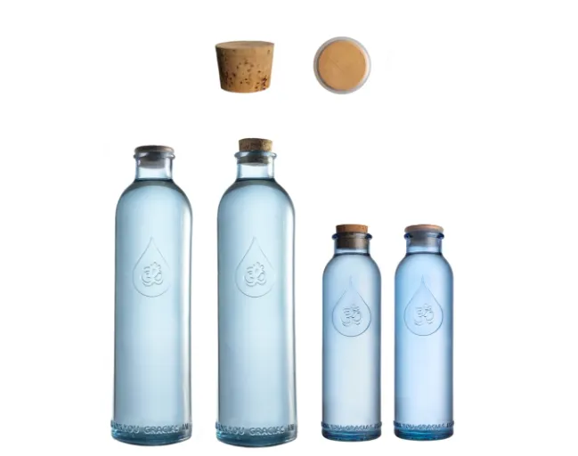 Bouteilles en verre recyclé sans métaux lourd de 1.23 L ou 0,50 L gravées Fleur de vie Om Gratitude, bouchon liège naturel ou Pleyad, housse coton Bio ou chanvre ou chanvre coton